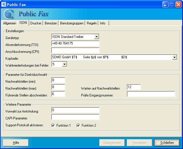 3.2 Karteikarte ISDNAuf der Karteikarte „ISDN“ machen Sie Einstellungen zu der ISDN-Karte, über die gefaxt werden soll. Hier können Sie für Sendedokumente eine Kopfzeile und eine Absenderkennung definieren. Mit den Einstellungen unter „Parameter für Direktdurchwahl“ sichern Sie, dass eine Faxnummer beim Faxempfang ordnungsgemäß an Public Fax durchgereicht wird und dort der Nummer entspricht, die für den Benutzer unter „Regeln“ eingetragen wurde.